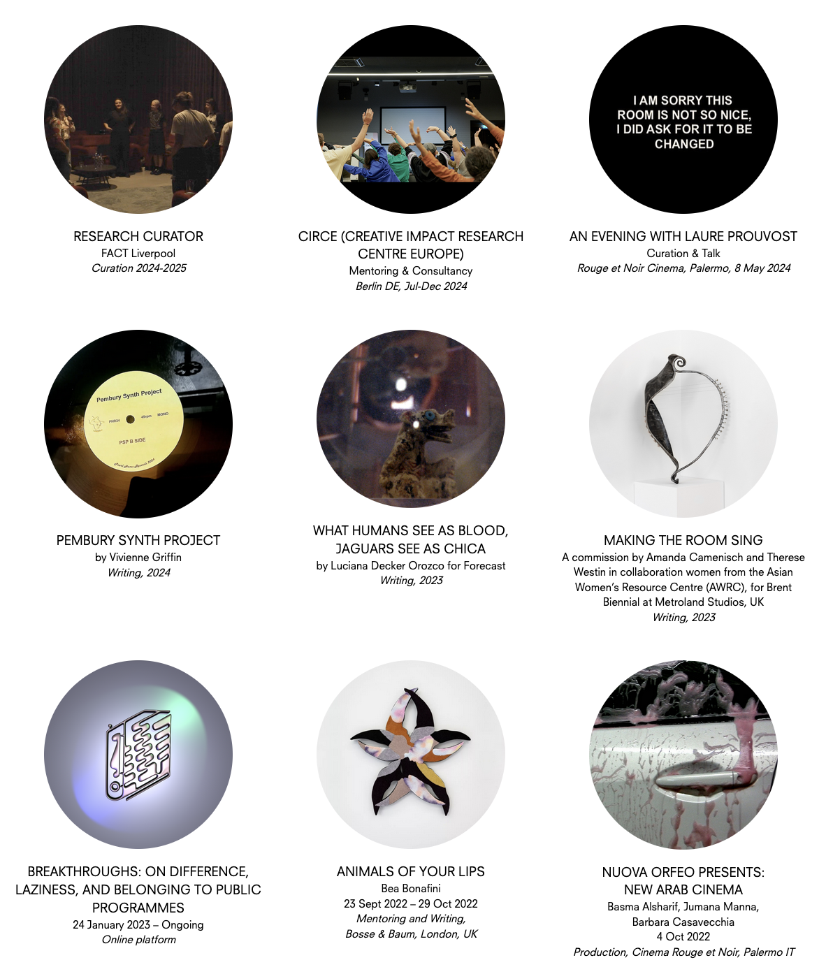 Recent curated projects include: Temporary Compositions, with Abbas Zahedi, Phoebe Davies, Joe Namy, Sonya Dyer, Somerset House, London UK (2021-2022); Create, Capture, Organise, Pluralise, with Josiane M.H. Pozi, Majed Aslam, Ilona Sagar, Col Self in collaboration with Farvash and vvxxii (Sp0re), Somerset House, London UK (2021); I Should Be Doing Something Else Right Now, with Maeve Brennan, Vivienne Griffin, rkss & Laura Fox, Rhea Storr, Sam Williams & Roly Porter, Somerset House, London UK (2020-2021); Bonds, with Laura Grace Ford, Anna Mikkola, Imran Perretta, Hannah Perry, Nick Ryan and Flora Yin-Wong at Gallery 31, Somerset House, London UK (2019-2020); The Distance is Nowhere, with Paul Maheke, Sophie Mallett, GAM Palermo IT (2018); Nimiia Cétiï, Jenna Sutela, Somerset House, London UK (both 2018); A Gesture Towards Transformation with Aimar Arriola, Nicole Bachmann, Omer Fast, Pedro G. Romero, Paul Maheke, Amalia Pica at Tenderpixel, London, UK (2017); Unknown Tongues, off-site sound event at Five Miles, London UK (2017); Tropical Hangover, with Salvatore Arancio, Zuzanna Czebatul, Rowena Harris, Laure Prouvost, Suzanne Treister at Tenderpixel, London UK (2017); Feeling In The Eyes, with Nina Beier, David Ferrando Giraut, Will Kendrick, Seth Price, Rustan Söderling at Tenderpixel, London UK (2016); The Role of Unintended Consequences, with Eva Fàbregas, Joey Holder, Laure Prouvost, at Syndicate, Cologne DE (2016).
